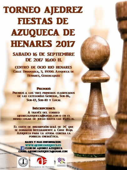 El pasado Sabado 16 de Septiembre, en las amplias y bonitas instalaciones del Centro de Ocio Henares, tuvo lugar el Torneo de Fiestas de Azuqueca de Henares que contó con la presencia de Dña. Carmen Luque Parejo, Consejala de Juventud del Ayuntamiento de Azuqueca de Henares mostrando su apoyo para seguir impulsando el ajedrez en nuestra localidad.